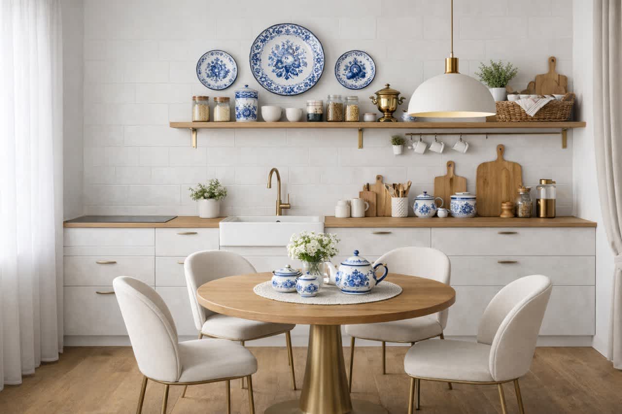 1. Избыток узоров и промыслов в одном пространстве. Когда гжель соседствует с хохломой, павлопосадский платок — с жостовским подносом, а все это дополнено резьбой и росписью, интерьер теряет глубину и превращается в декорацию. Русский интерьер любит паузы, спокойный фон и один-два выразительных акцента, а не визуальный шум.