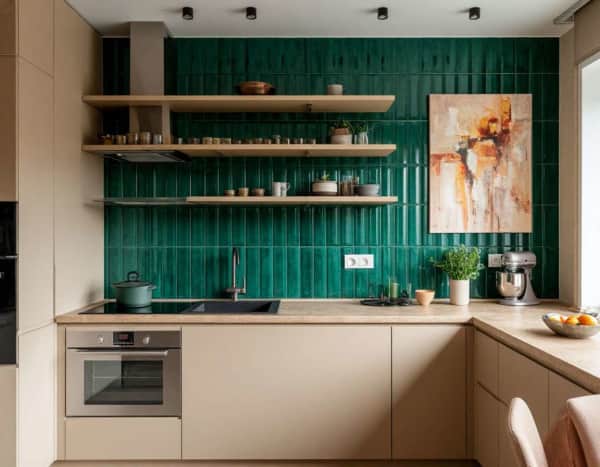 5. Акцент на фартуке, отделке стены и декоре. Красивая плитка, керамогранит с выразительной текстурой, фактурная штукатурка становятся полноценным элементом дизайна, а не фоном.